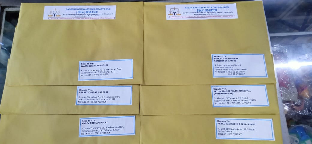 “Melalui Badan Bantuan Hukum Indikator, Hari ini Kita surati , Kapolri, Kabareskrim Polri, Kabid Propam Mebes Polri, Wassidik Mabes Polri, Komisioner HAM RI, Kompolnas RI, dan Kabag Wasidik Polda-Su, karena kita menganggap Laporan kita Sudah tidak sesuai dengan Penanganan nya” jelas Bambang Santoso SH