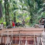 Di sana, terlihat kompaknya personel Satgas dengan warga yang bahu membahu dalam gotong royong membangun sebuah jembatan pada badan jalan desa yang telah dibuka.