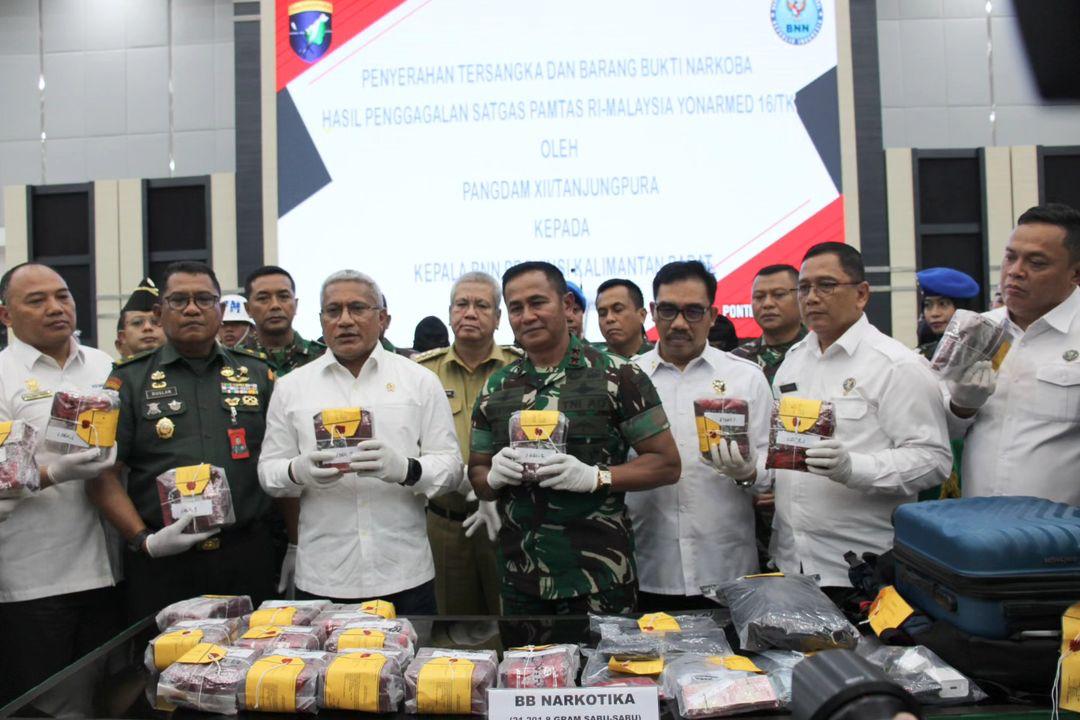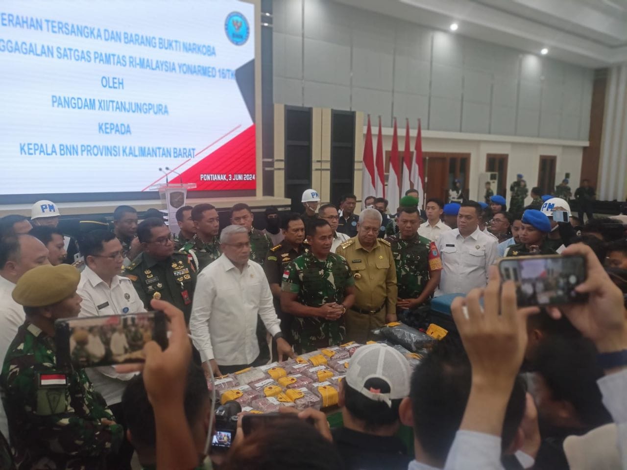 Gi -Media PONTIANAK (Kalbar), Komandan Satgas Pamtas RI-Malaysia Letkol Arm Andreas Prabowo Putro, S.I.Pem., M.I.P., M.Han menghadiri penyerahan barang bukti narkoba jenis sabu seberat 21,2 Kg dan 5 orang tersangka kepada BNN RI di Aula Sudirman, Makodam XII/Tpr, Kota Pontianak hari Senin kemarin (03/06/2024).