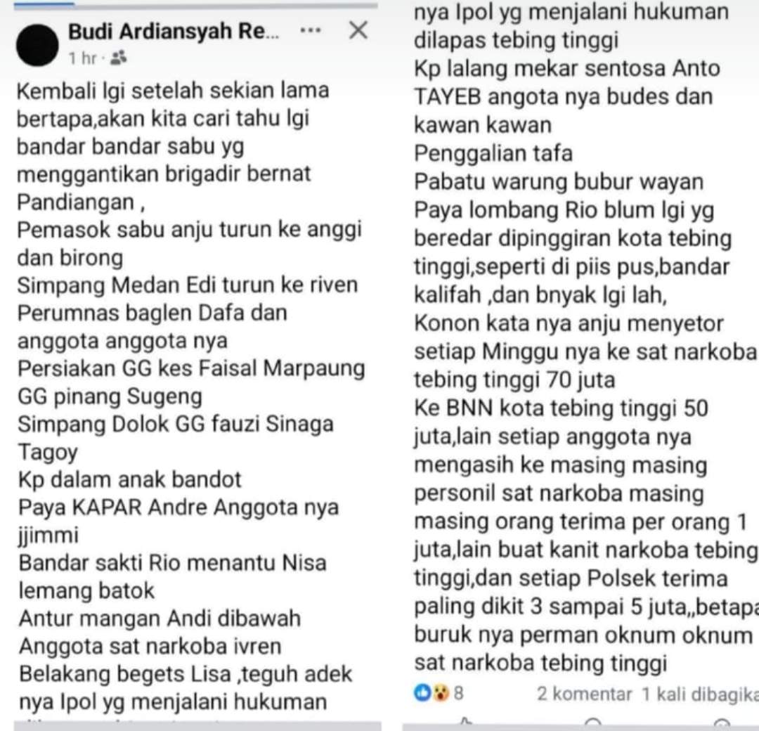Unggahan “Budi Ardiansyah refleksi” juga memaparkan nama dan tempat diduga para bandar narkoba yang beroperasi di wilayah hukum polres Tebingtinggi