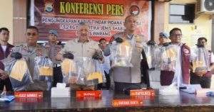 Pengungkapan kasus menonjol tersebut disampaikan Kapolres Pinrang dalam konferensi pers yang digelar di Mapolres Pinrang, disaksikan Bupati Pinrang, Kasi Humas, Kasat Resnarkoba beserta jajaran, serta puluhan awak media cetak dan elektronik.