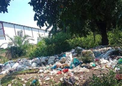 Sampah liar menggunung dan dibiarkan berserakan bebas di area belakang Kantor Gedung Inovasi KEK,berbagai jenis sampah plastik, karung bekas, botol minuman, hingga limbah rumah tangga dibuang sembarangan di lahan terbuka