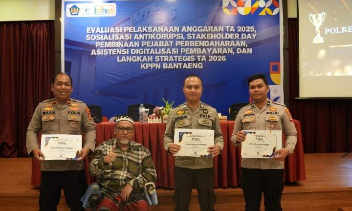 Jeneponto-Gi Media -Com- 7/2/2026 – Dalam forum evaluasi dan koordinasi yang digelar oleh Kantor Pelayanan Perbendaharaan Negara (KPPN) Bantaeng, Polres Jeneponto berhasil menyabet tiga penghargaan sekaligus. Penghargaan tersebut diterima oleh Aiptu Suparman perwakilan Polres Jeneponto yang hadir dalam kegiatan bertajuk “Evaluasi Pelaksanaan Anggaran TA. 2025, Sosialisasi Anti Korupsi, Stakeholder Day, Asistensi Digitalisasi Pembayaran, dan Langkah Strategis TA 2026” di Hotel Kirei Bantaeng, Kamis (5/2/2026) lalu.